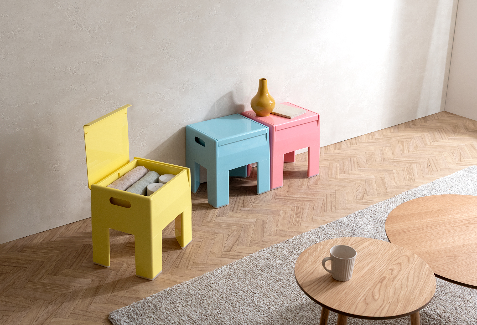 ツヤ感と丸みのあるデザインがレトロ可愛い収納スツール『Ponetta(ポネッタ)』。 気軽に座れるコンパクトなスツールは座面部分のフタを開くと中が収納スペースになっており、雑誌や小物をサッと収納できます。 軽量で持ち運びもカンタン。6カラーからお好みでお選びいただけます。