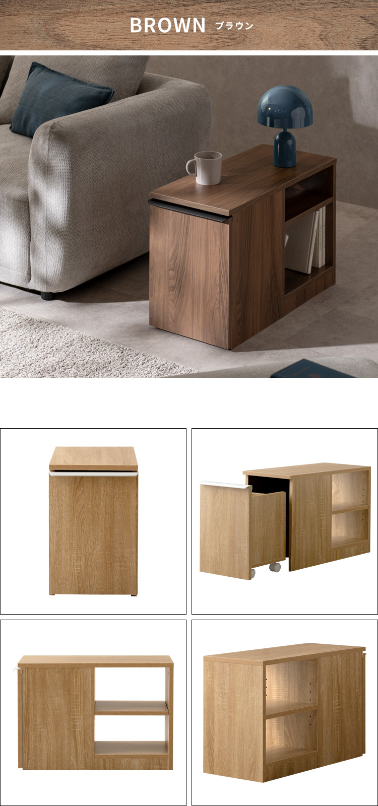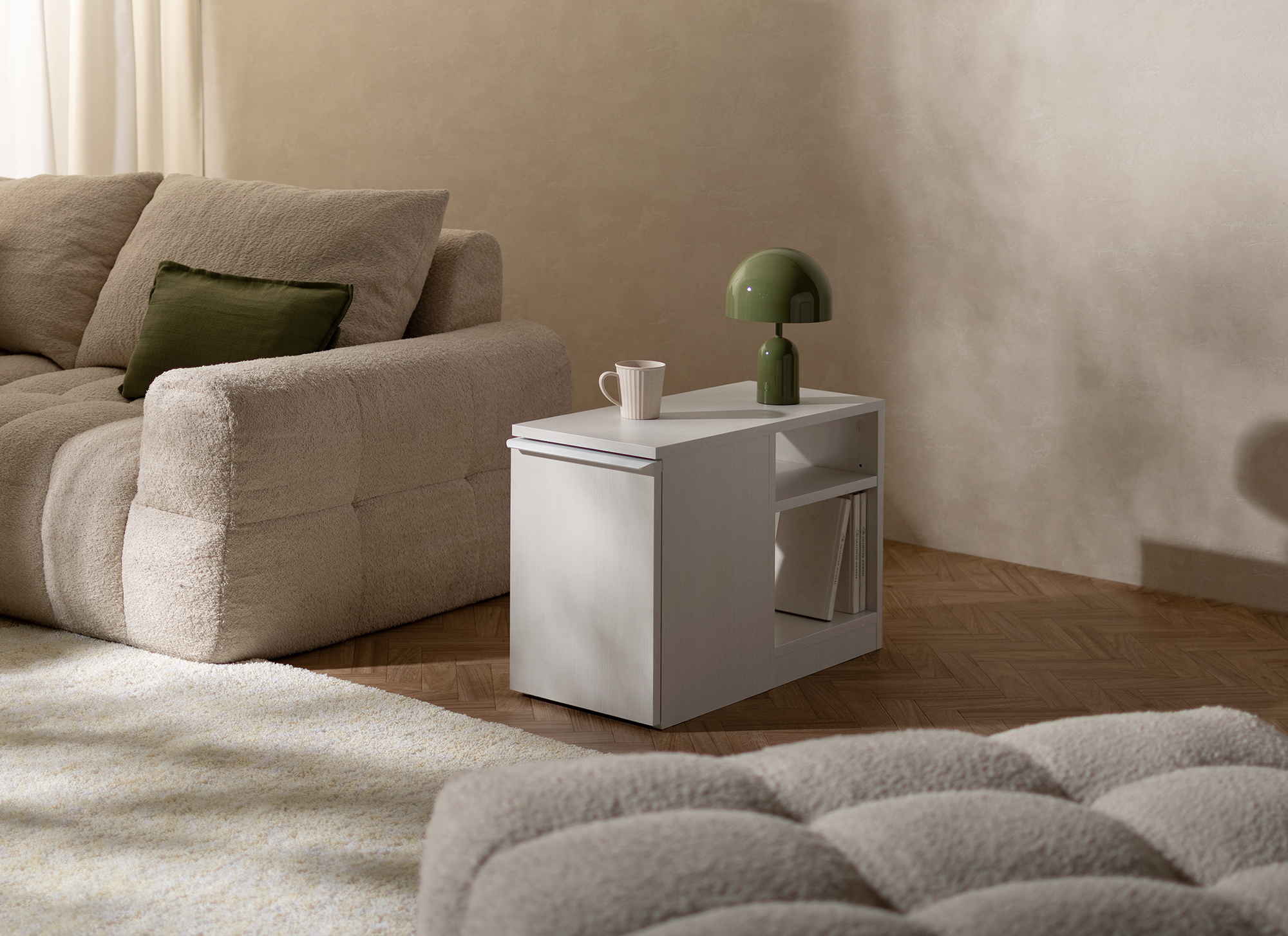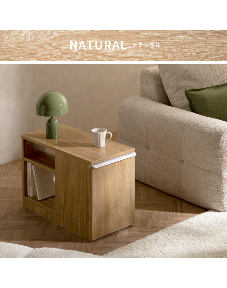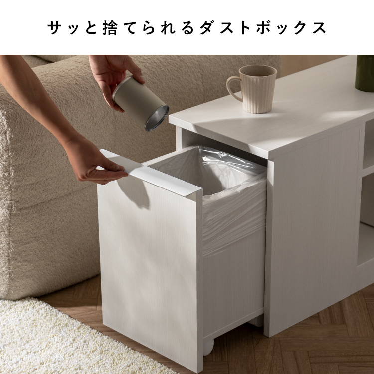 リビングでのくつろぎを快適にお過ごしいただけるダストボックス付きサイドテーブル『NotT(ノット)』。 ソファの横でマグカップやリモコンを置ける天板、本や雑貨を収納できる収納棚、リビングで出たゴミをサッと捨てられるゴミ箱が一つになった便利なアイテムです。 カラーはホワイト、ナチュラル、ブラウンの3カラーからお部屋の雰囲気やお好みでお選びいただけます。