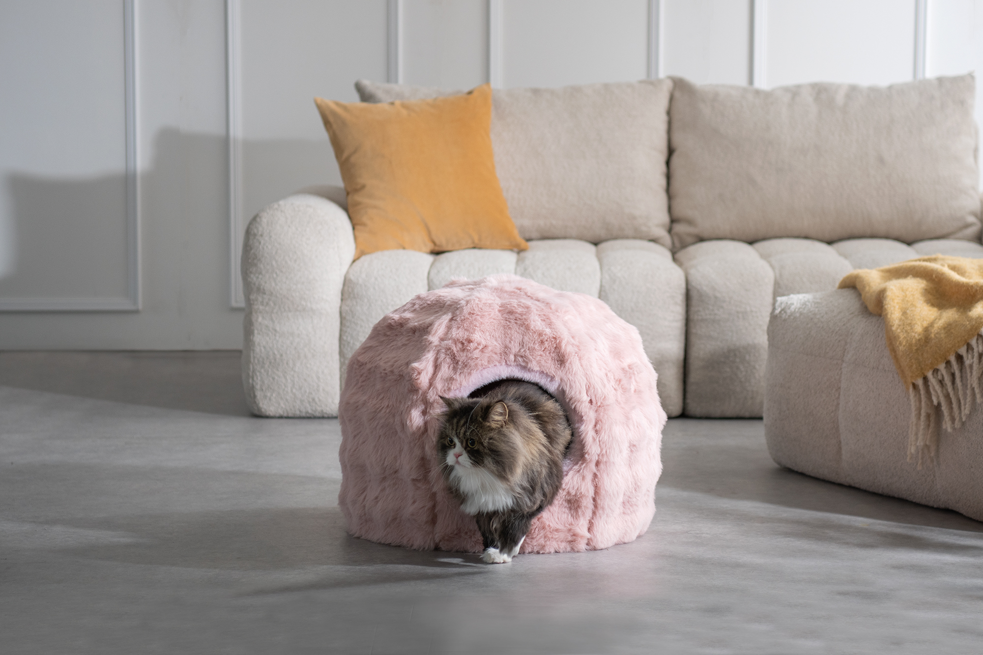 ふわとろなマイクロファイバー生地の可愛いドーム型ペットベッド『Foure(フール)』。 狭くて落ち着くドームの中にはリバーシブルクッション付き。猫はもちろん小型犬もお使いいただけます。また、上部を潰せばベッド型にもなります。 カラーはホワイト、ピンク、ベージュ、グレーの4種類。お部屋の雰囲気やお好みでお選びいただけます。